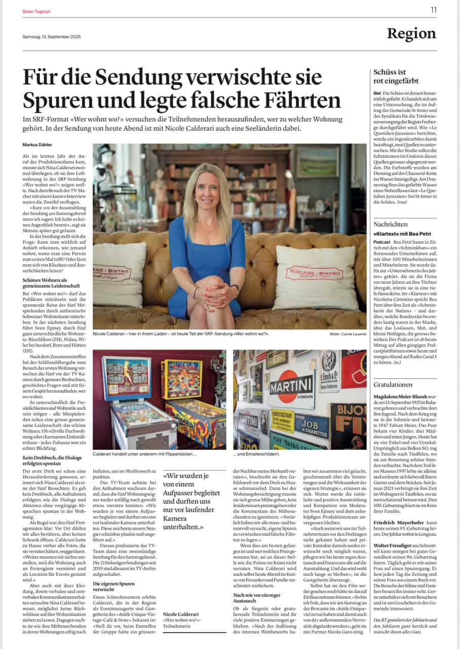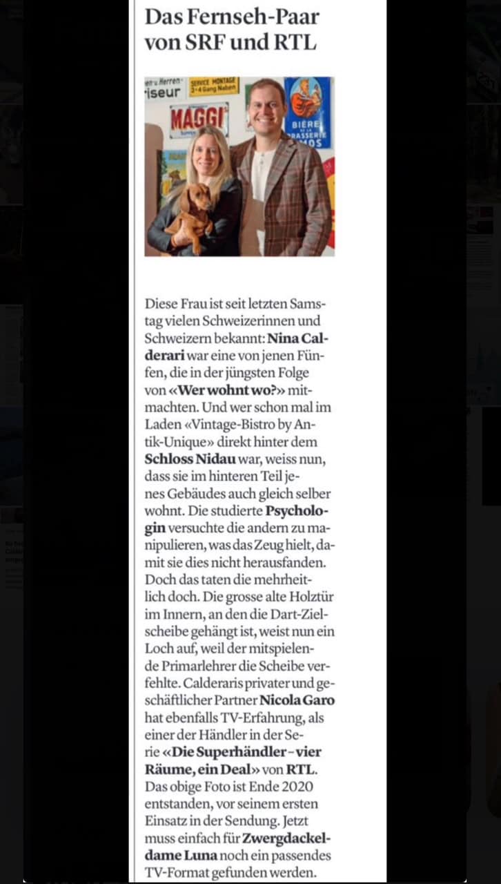 Toller Bericht über Antik-Unique und Nina Calderari als Teilnehmerin der TV Sendung «Wer wohnt wo?» mit Sven Epiney auf SRF.