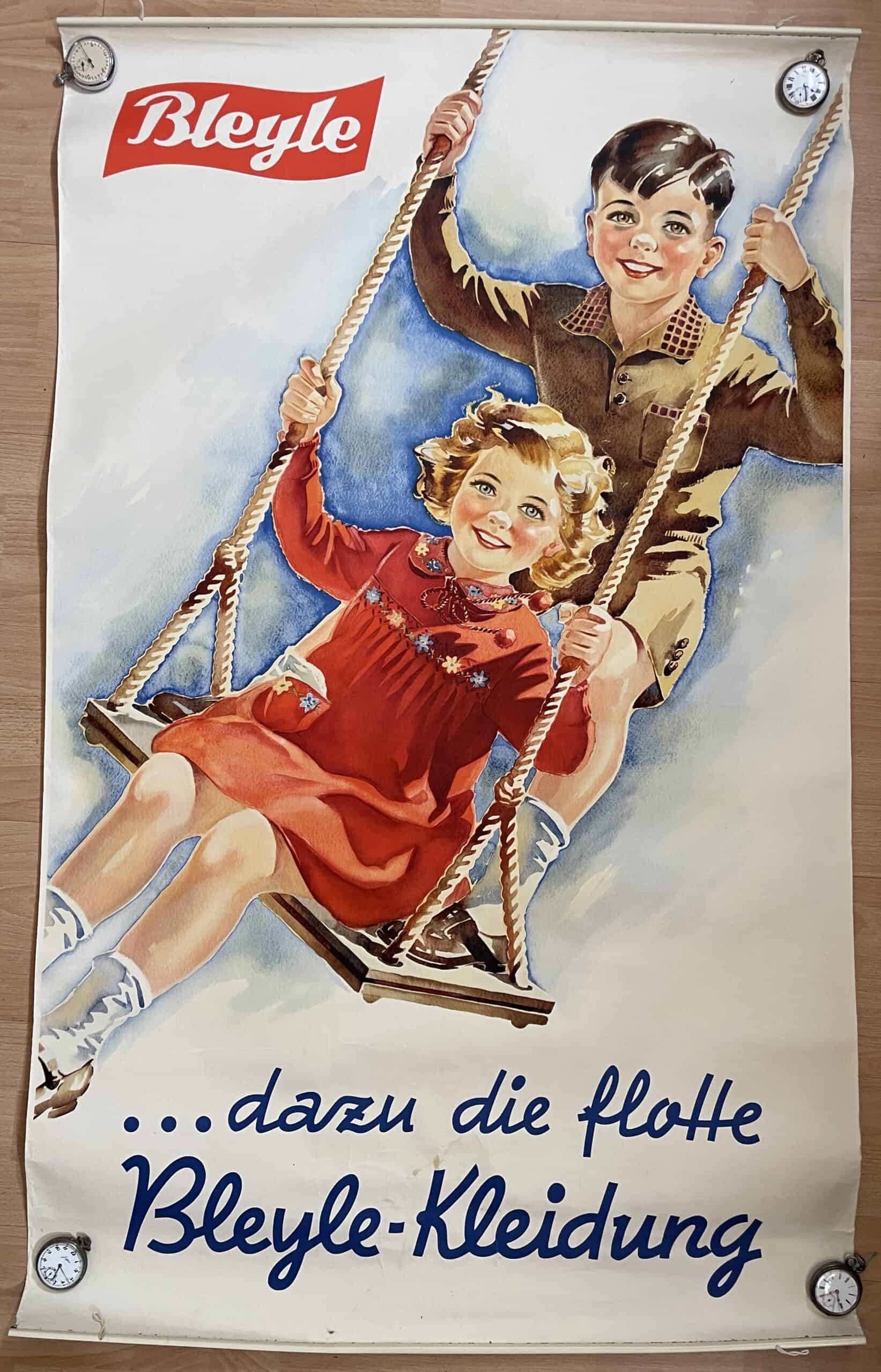 Wundervolles nostalgisches Werbeplakat der Marke Bleyle, das zwei fröhlich schaukelnde Kinder in typischer Mode der Zeit zeigt. Die lebendigen Farben und der charmante Illustrationsstil verleihen dem Plakat eine tolle Ausstrahlung. Mit dem Slogan „… dazu die flotte Bleyle-Kleidung“ ist es ein schönes Zeitdokument und ein echter Blickfang für Sammler von Vintage-Werbung.