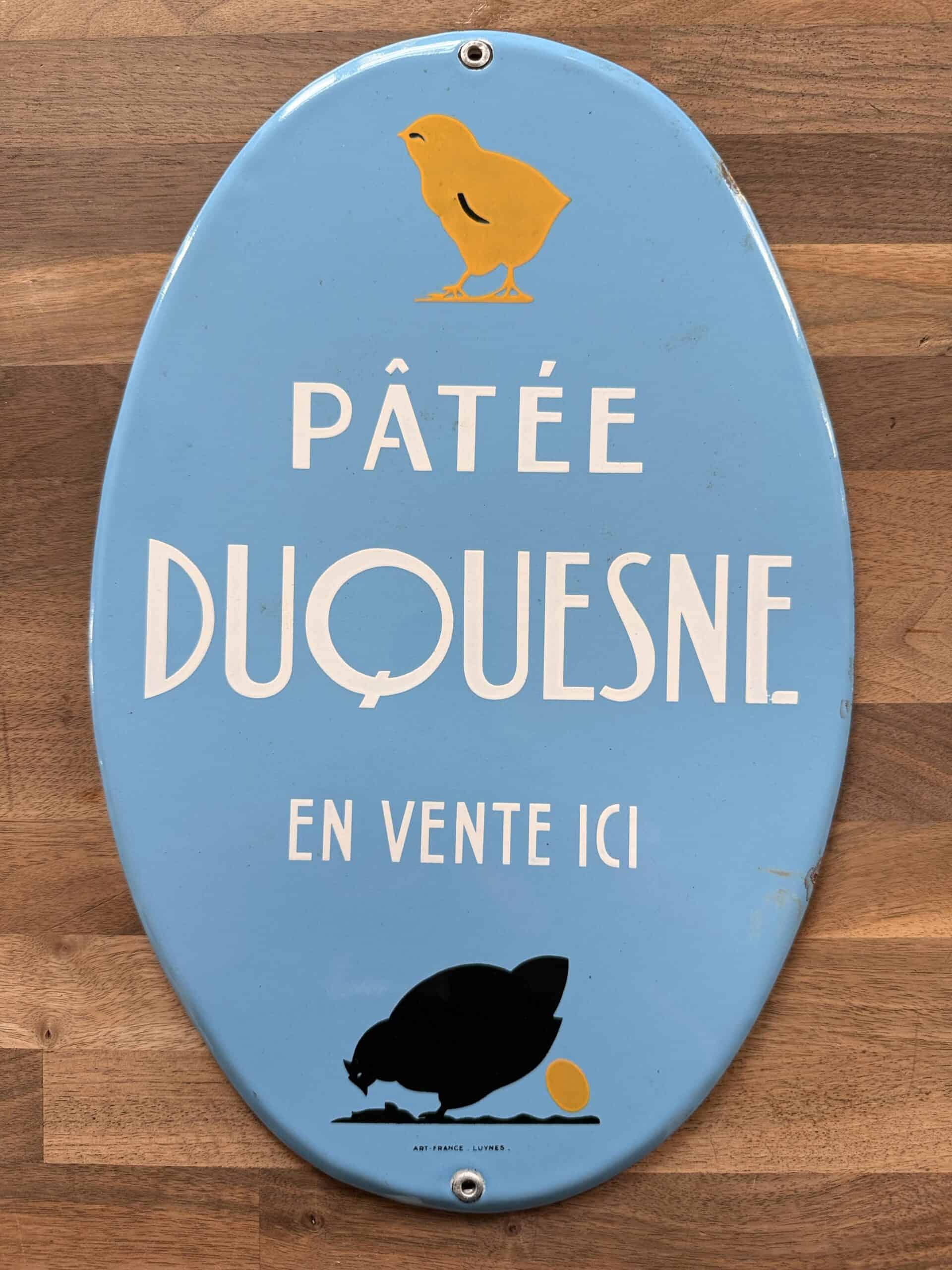 Wunderschönes Emailschild in Hellblau von Patée Duquesne Frankreich.