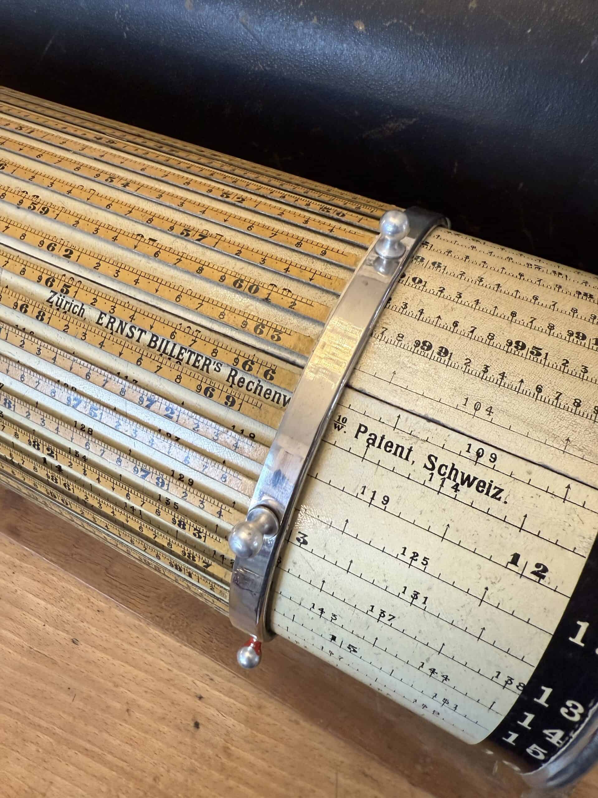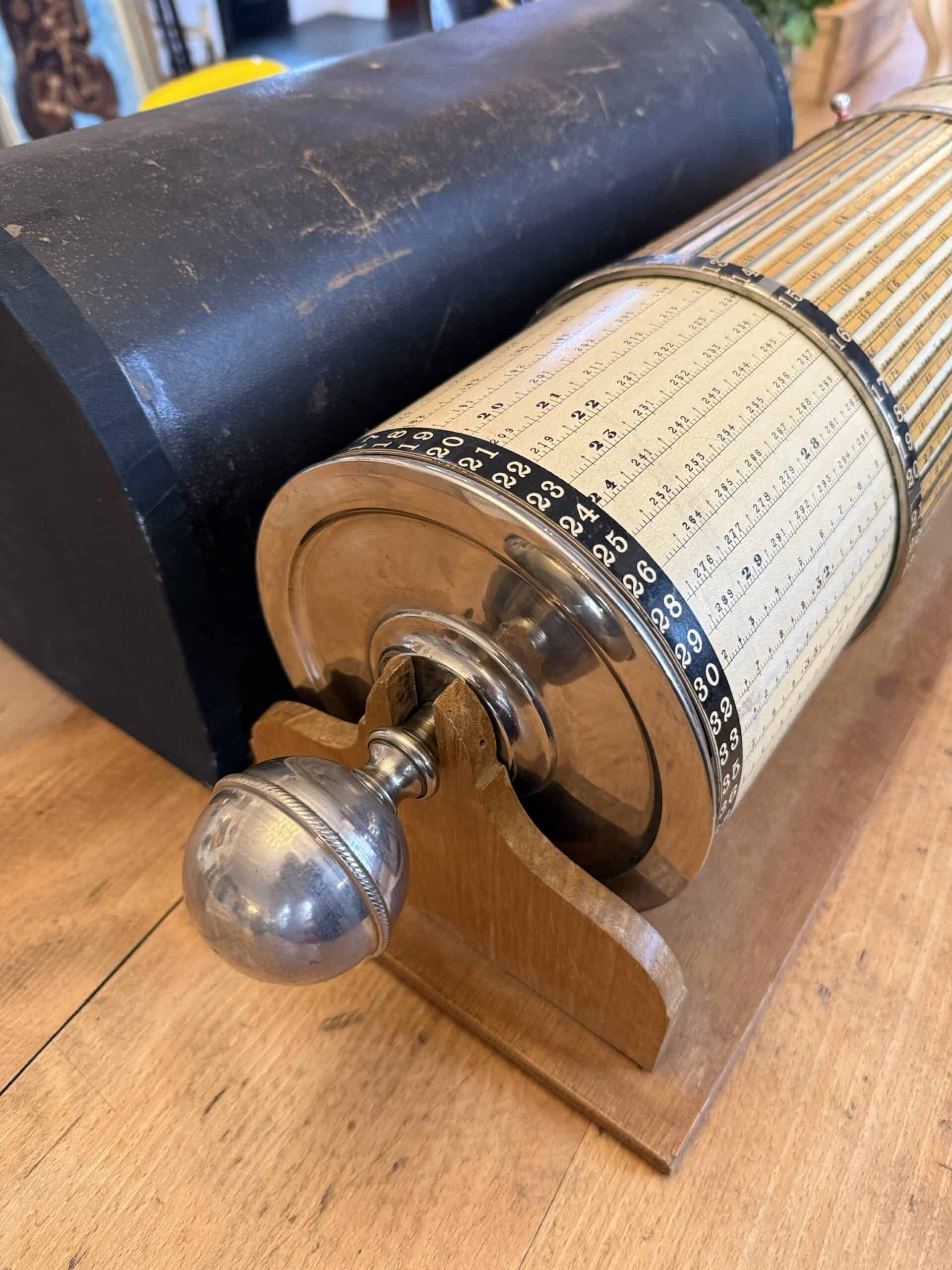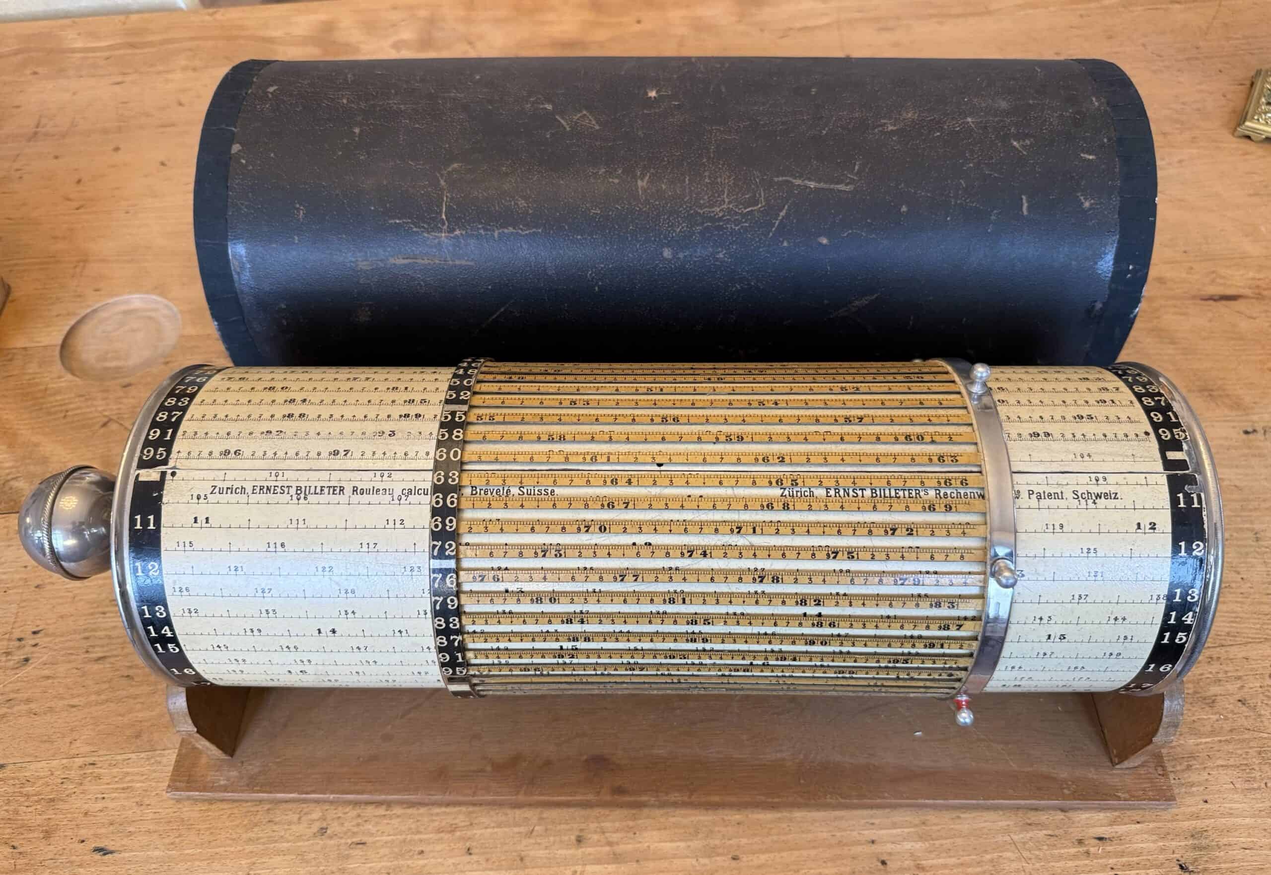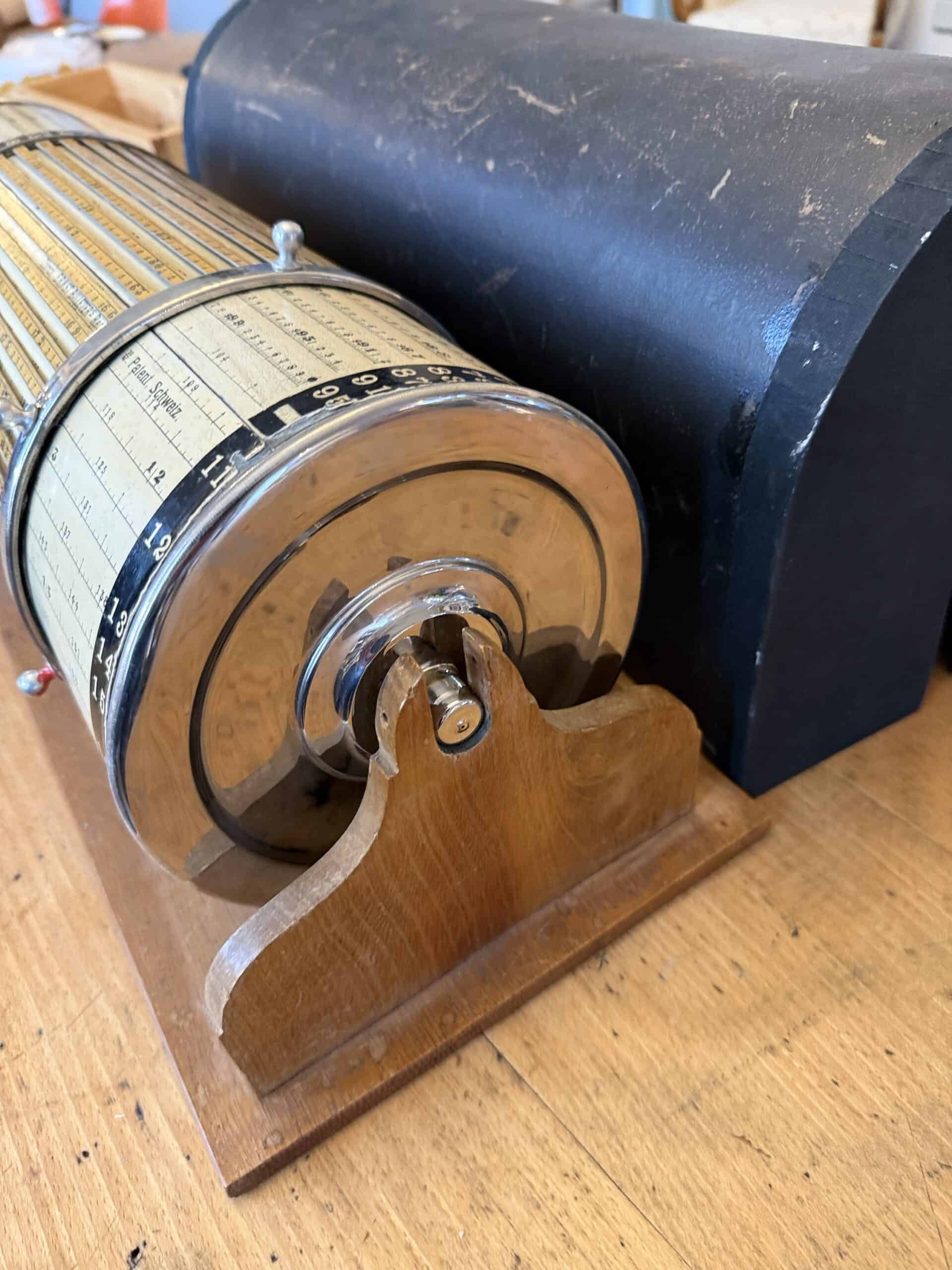 Schweiz, um 1900. Hersteller: Ernst Billeter, Zürich. Holz/Metall. Rechentrommel auf Holzgestell mit Kugelgriff und Haube.