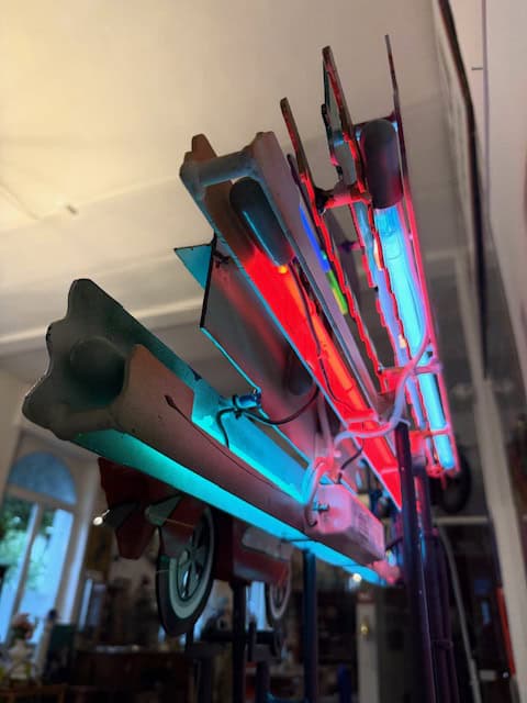 Handbemalter Stahl mit 3 Farben Neoninstallation und einem ausbalancierten Pendel.