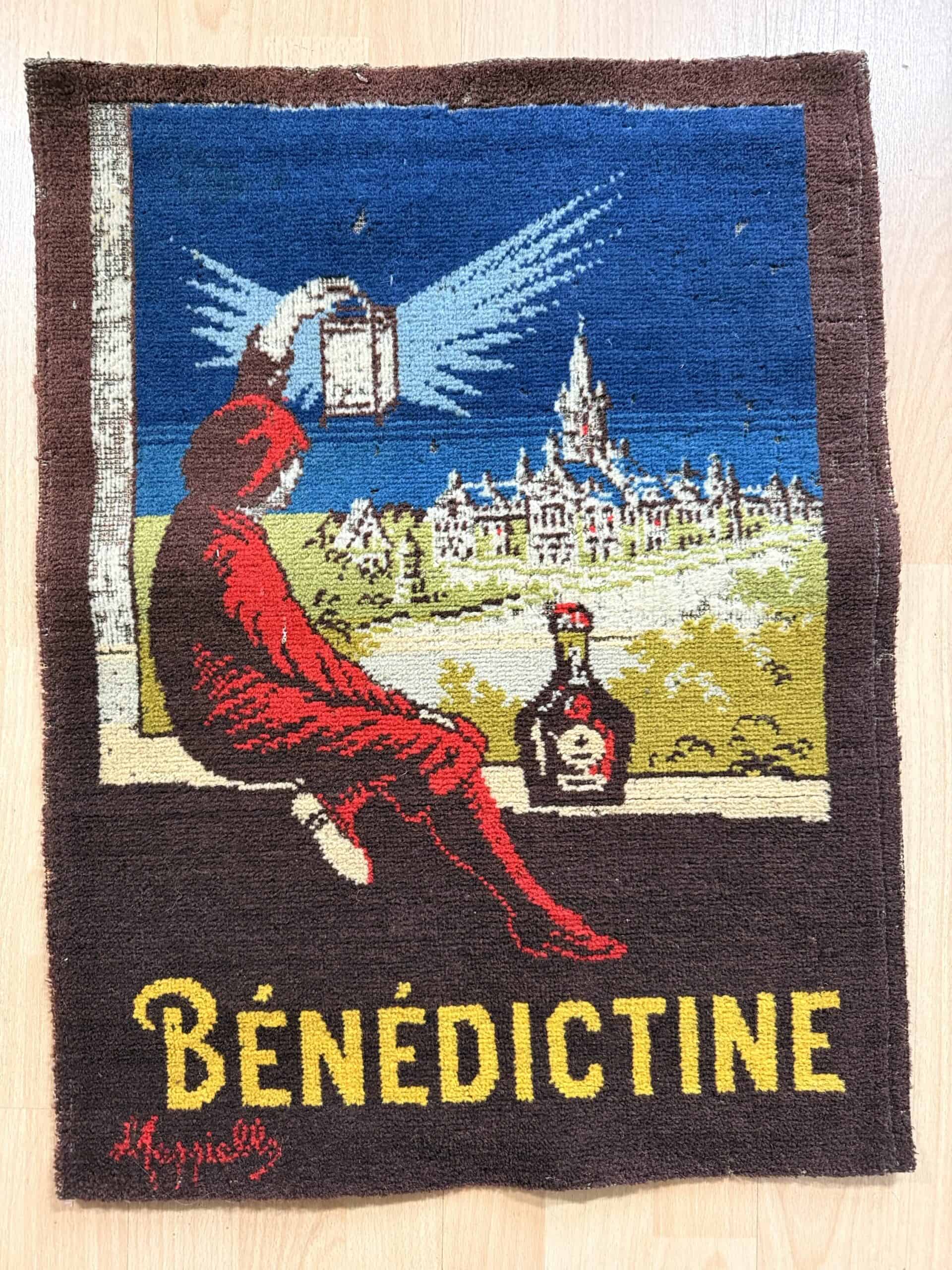 Historischer antiker Jassteppich des Plakatkünstlers Leonetto Cappiello mit wunderschönem Motiv von Benedictine.