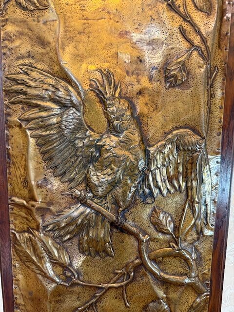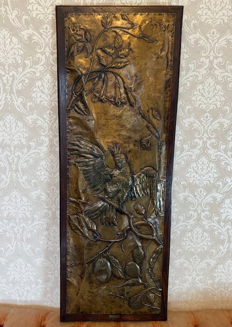Aussergewöhnliches Relief aus getriebenem Kupfer mit Abbildung eines Kakadu und einer reichen Flora.