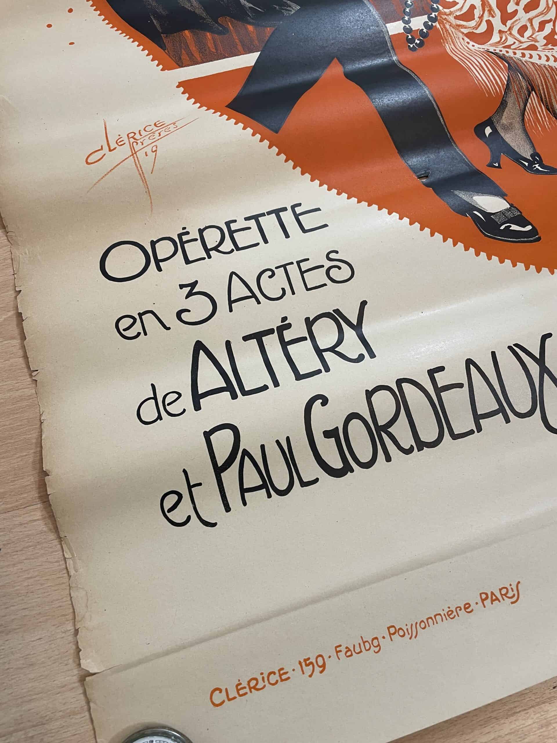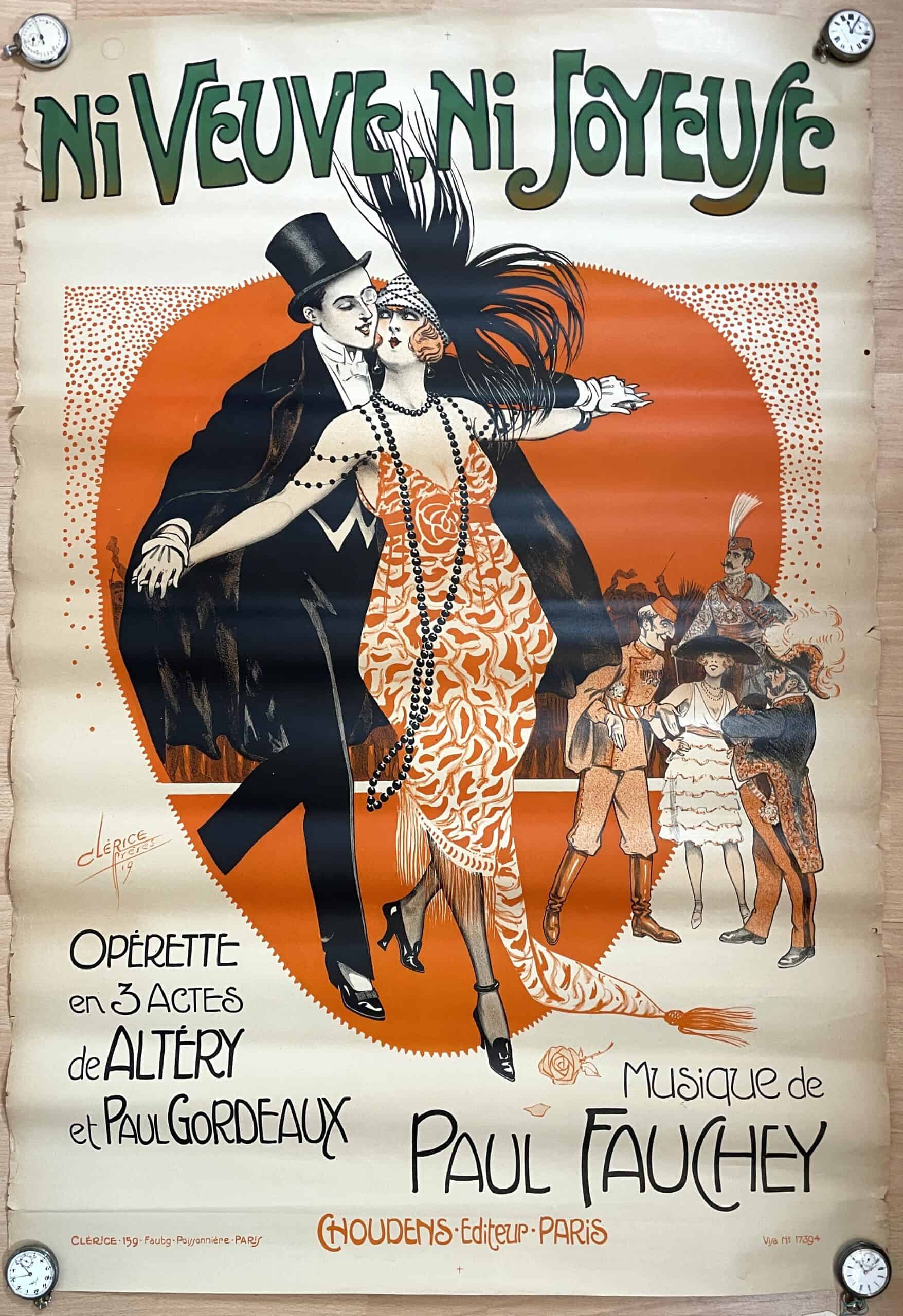 Wunderschönes Jugendstil-Plakat zur Operette Ni Veuve Ni Joyeuse aus der Zeit um 1900. Entworfen von den Clérice Frères, produziert in Paris, Frankreich. Das Plakat ist in gutem Zustand mit diversen Randschäden (siehe Fotos).