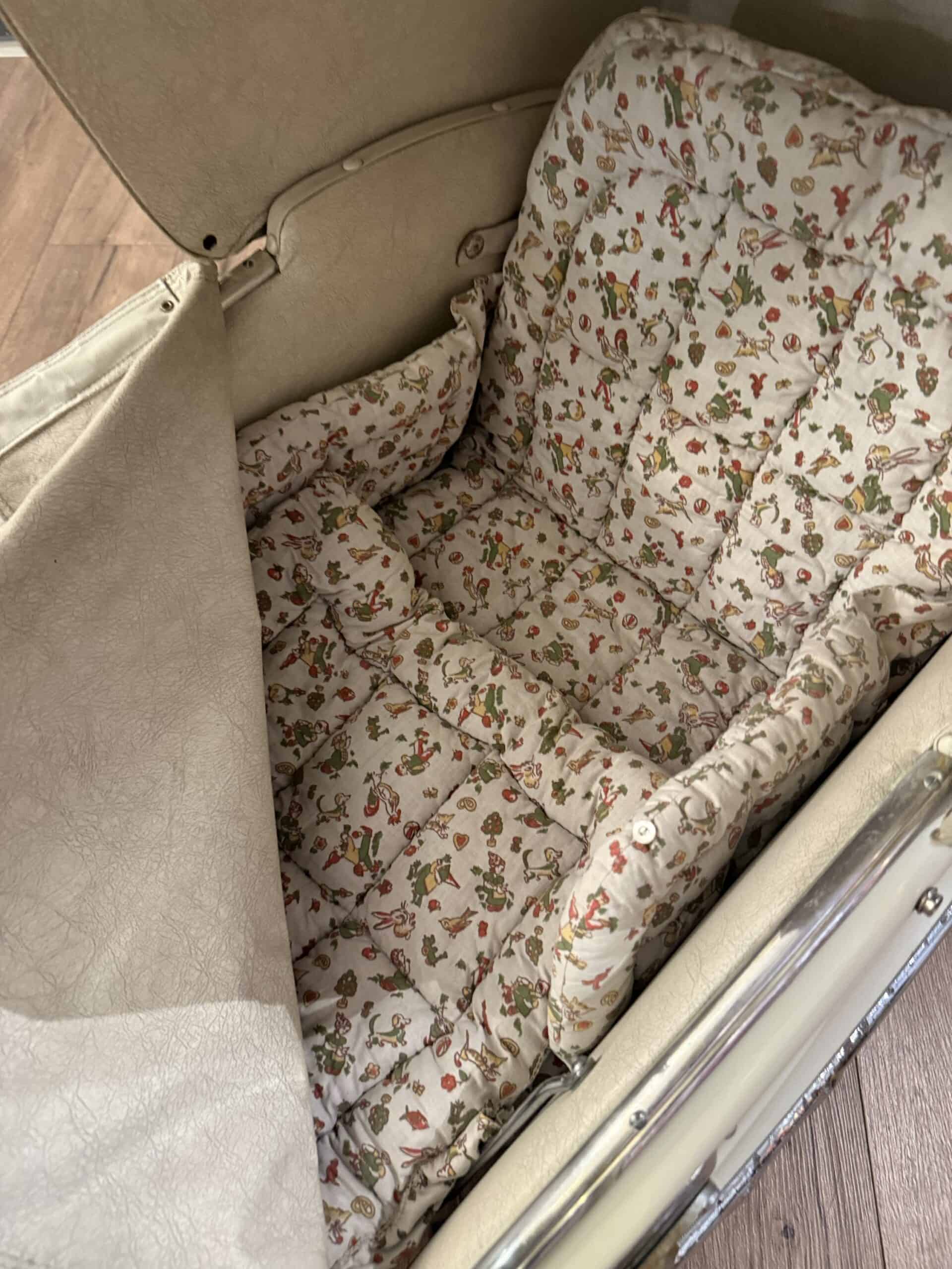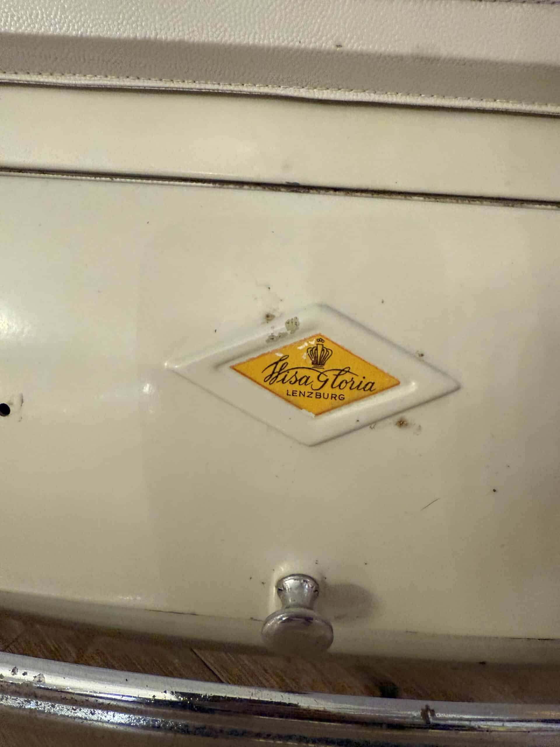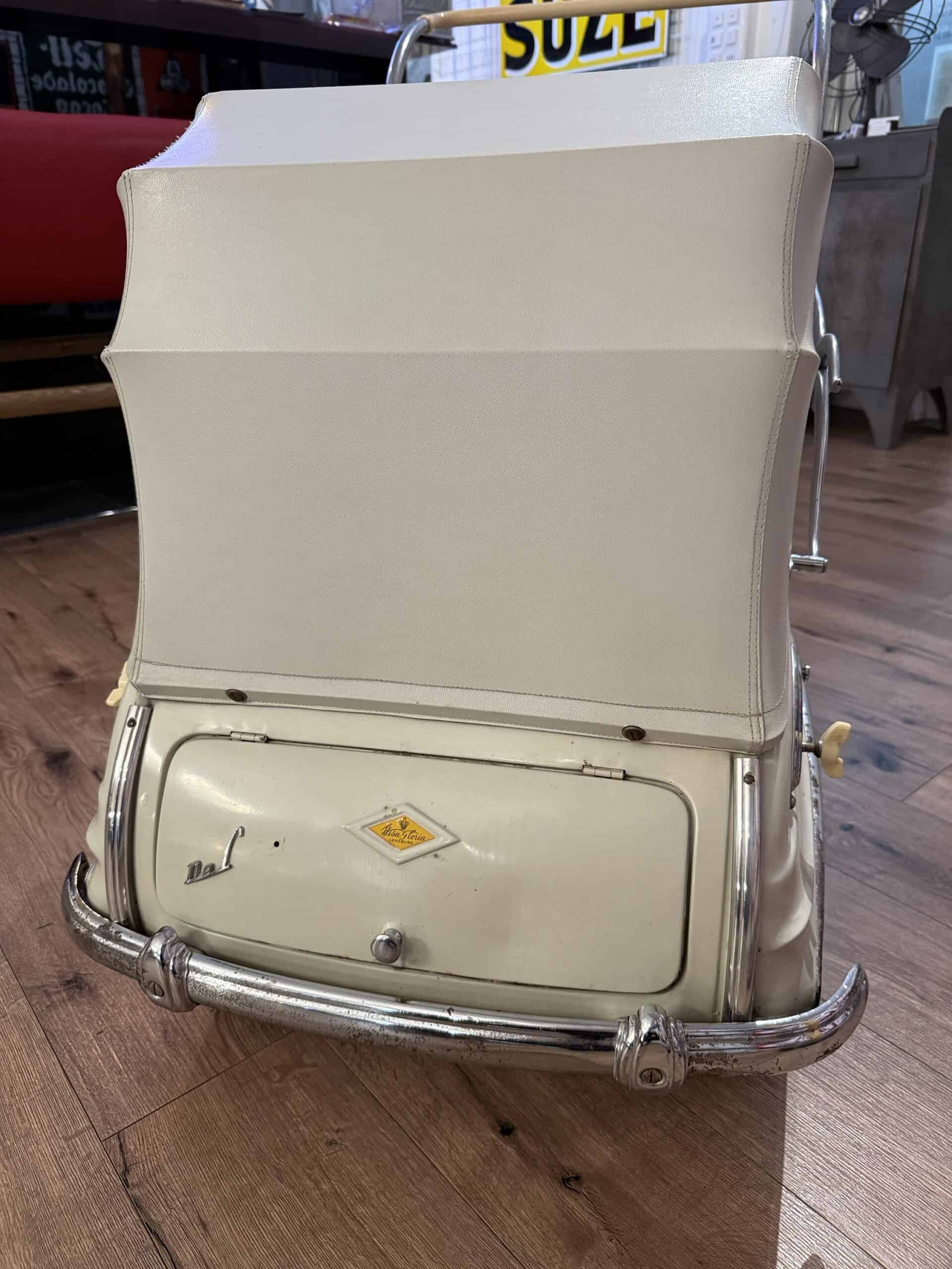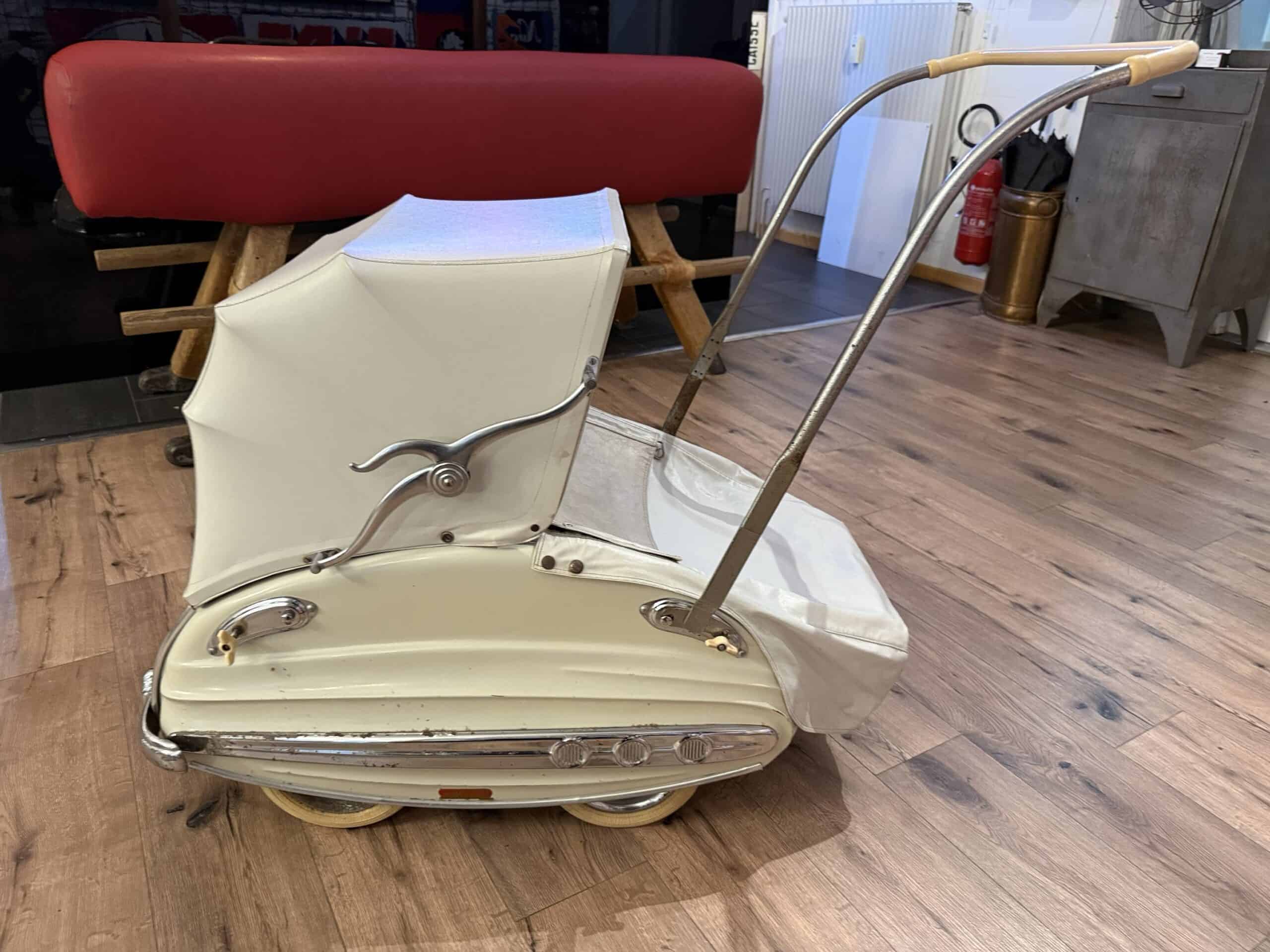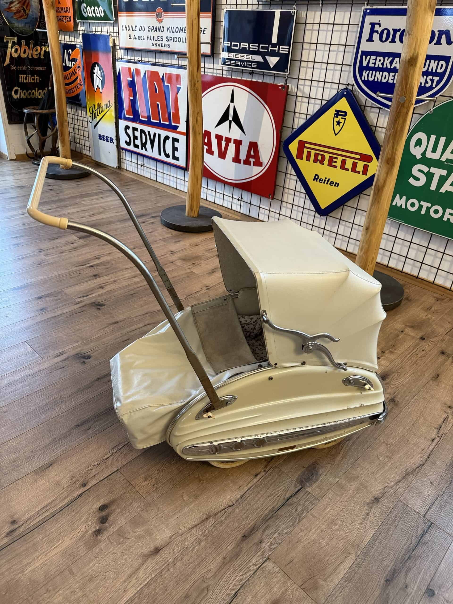 Wie ein Caddillac kommt dieser Kinderwagen aus Blech daher. Wisa Gloria hat mit diesem Stück ein echten Hingucker produziert. Das Rollen geht Kinderleicht und Geräuschlos. Das Verdeck scheint wie neu, wurde ev neu aufgebaut. Hinten ein kleiner Kofferraum für die Milchflasche.
