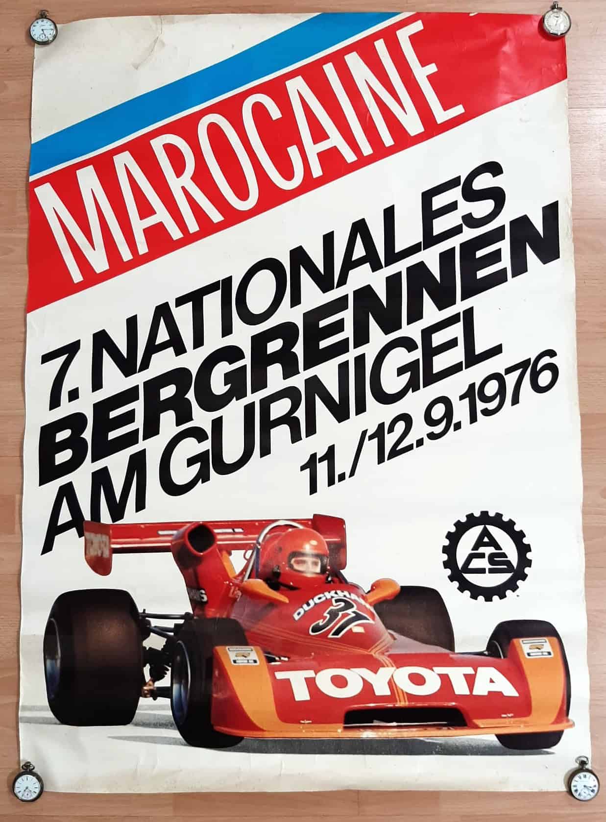 Tolles Werbeplakat von Marocaine für das 7. Bergrennen am Gurnigel im Jahr 1976. Ein eindrucksvolles Zeitdokument in schönem Zustand mit nur wenigen Randschäden.