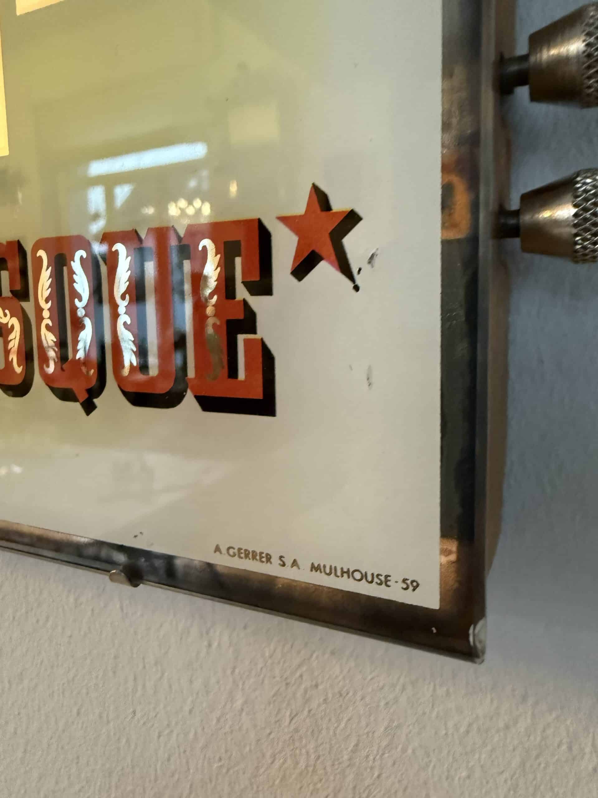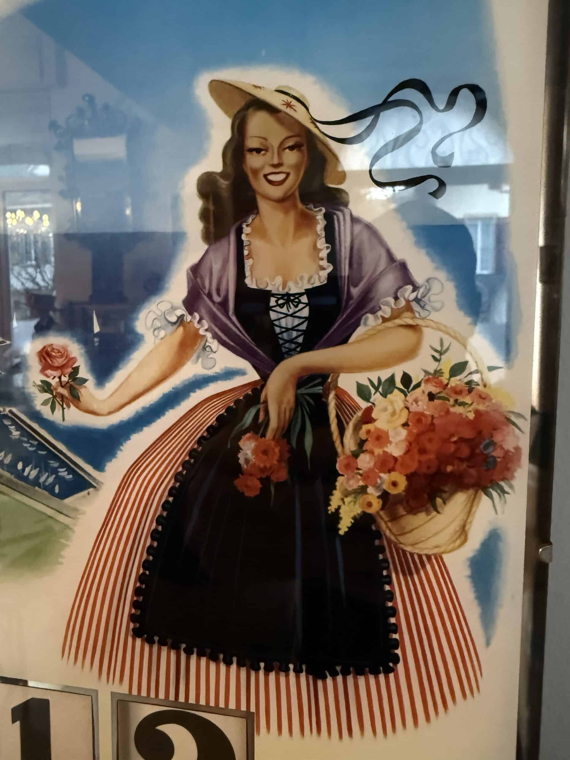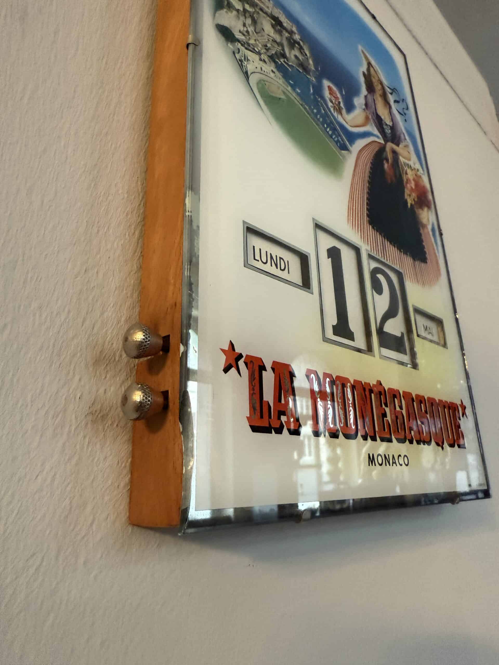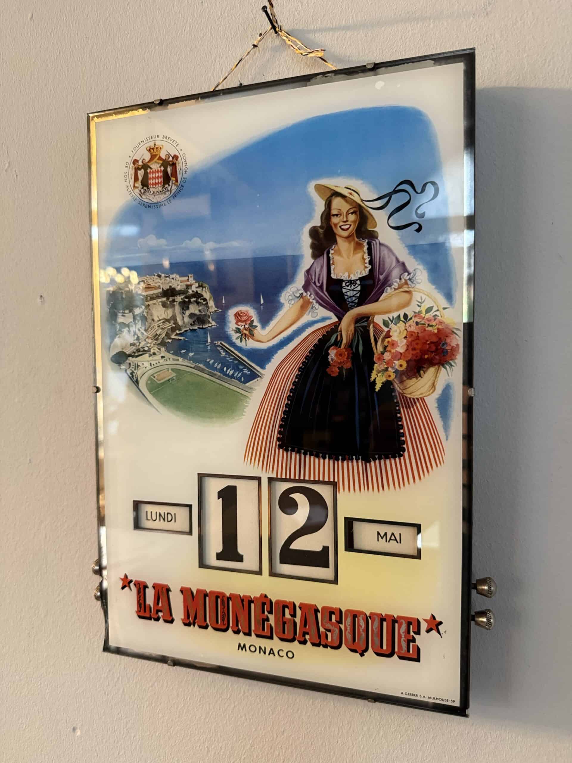 Sehr schöner Hinterglas Kalender mit verstellbarer Datumsanzeige und Werbung für Monegassische Trachten.