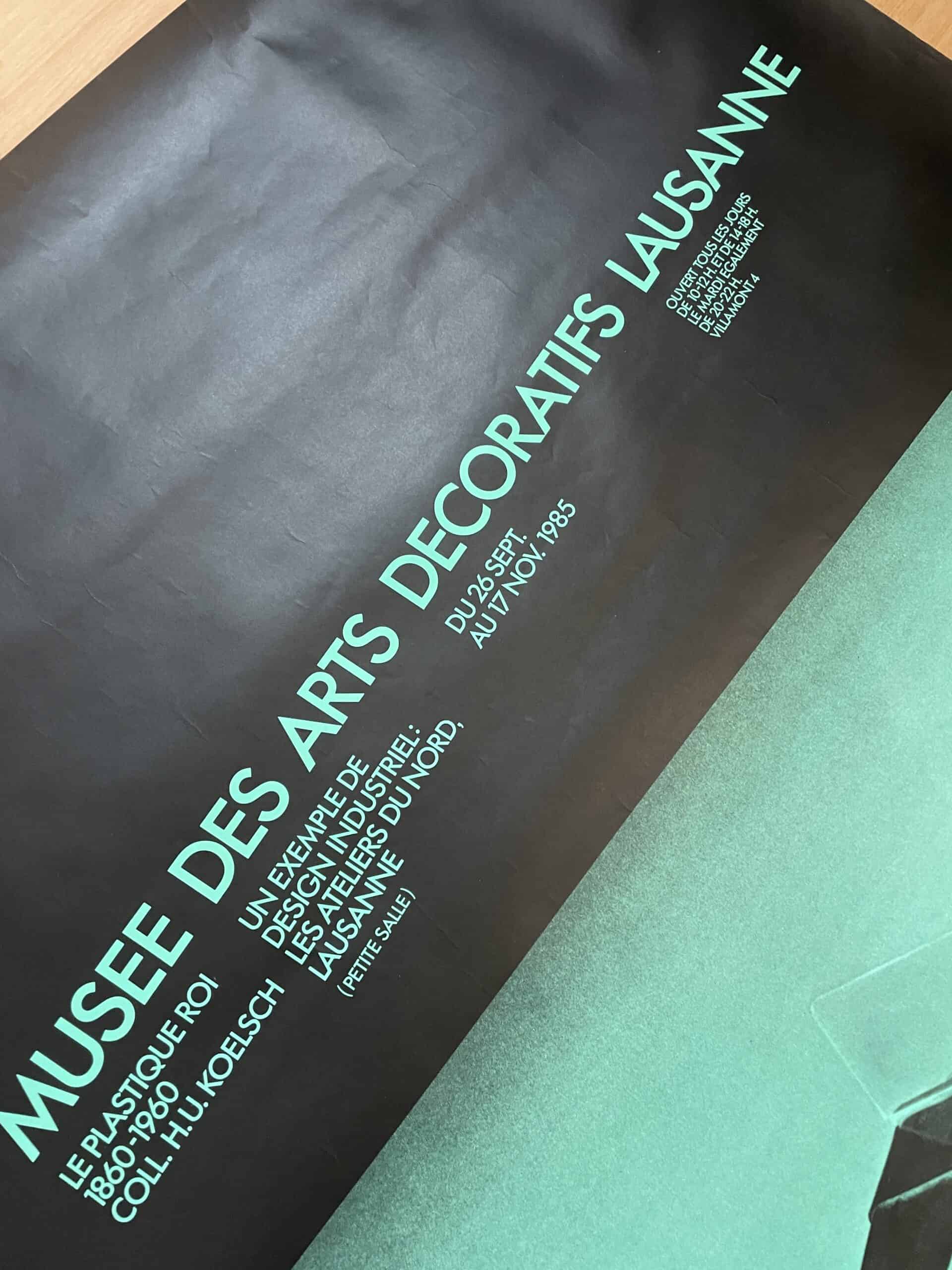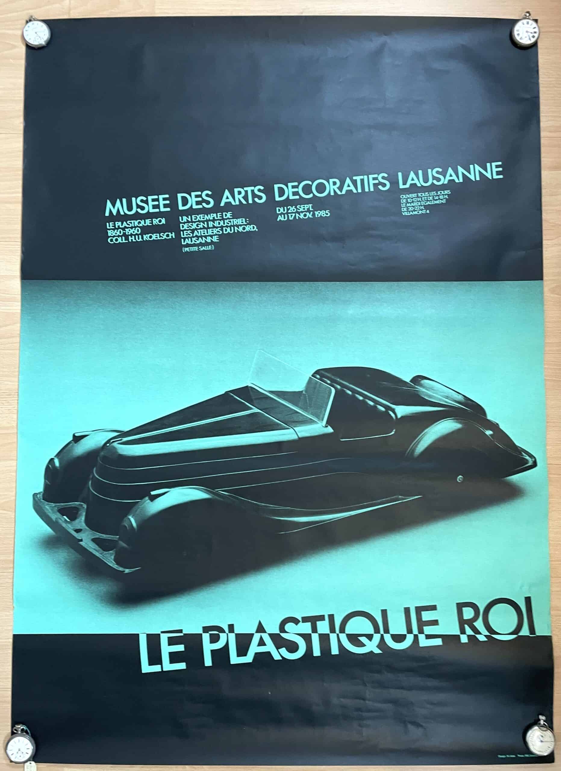 Plakat für die Ausstellung „Le Plastique Roi“ (Der Plastikkönig), die im Musée des Arts Décoratifs in Lausanne stattfand.