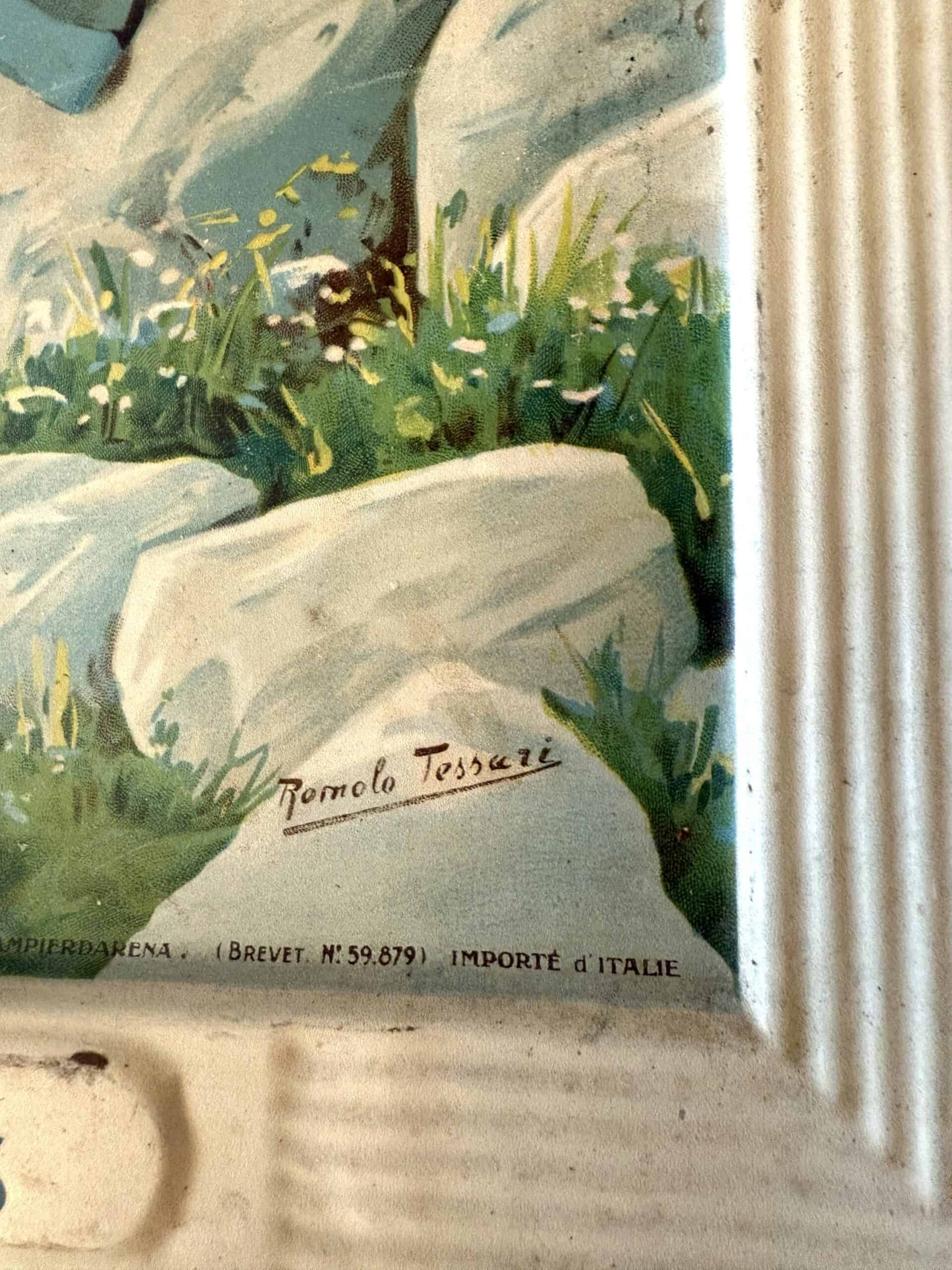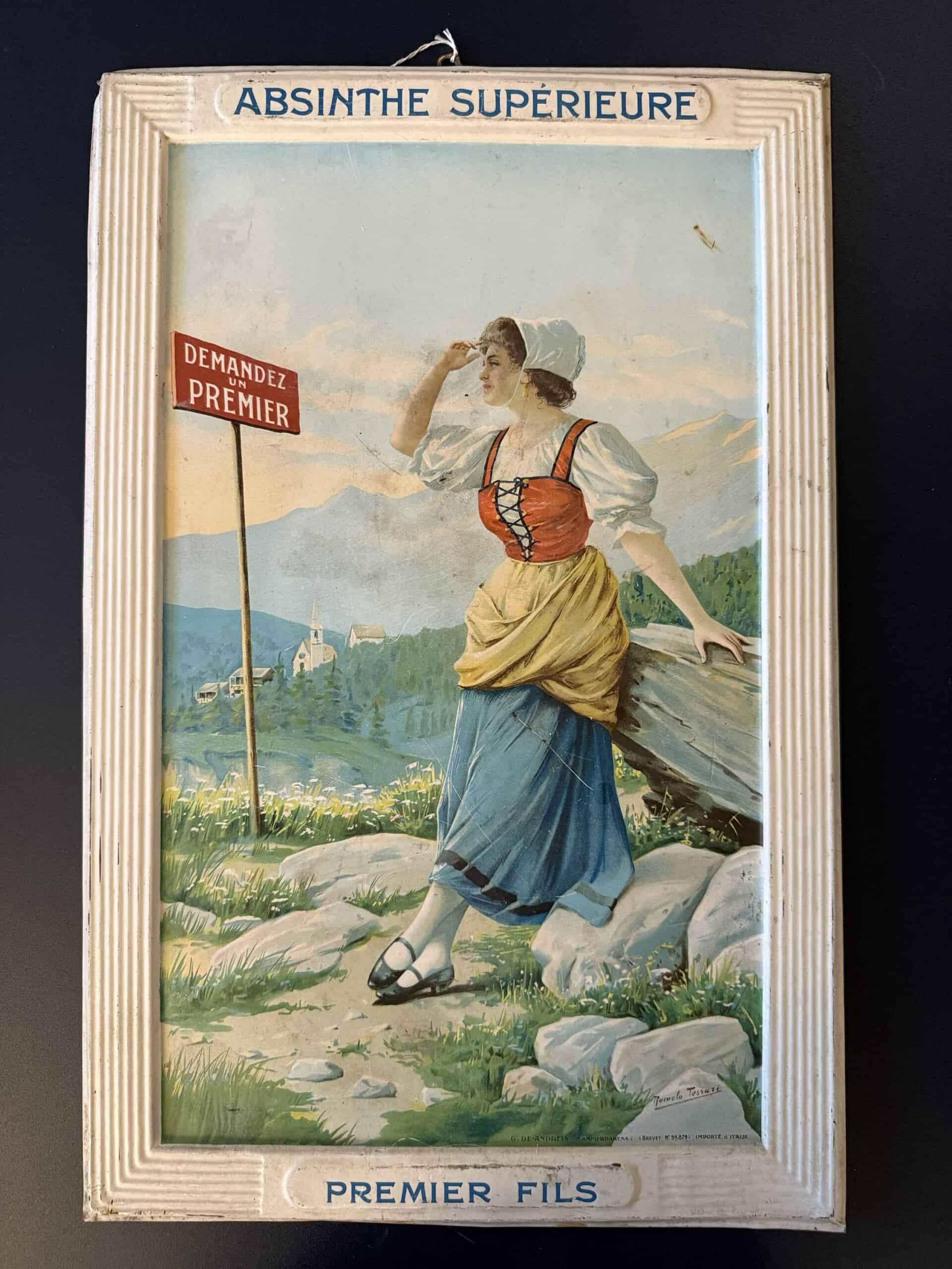Traumhaftes Blechschild für Absinthe Superieure von Premier&Fils. Der Plakatkünstler Romolo Tessari hat diesen Entwurf gestaltet, das Schild ist Signiert.