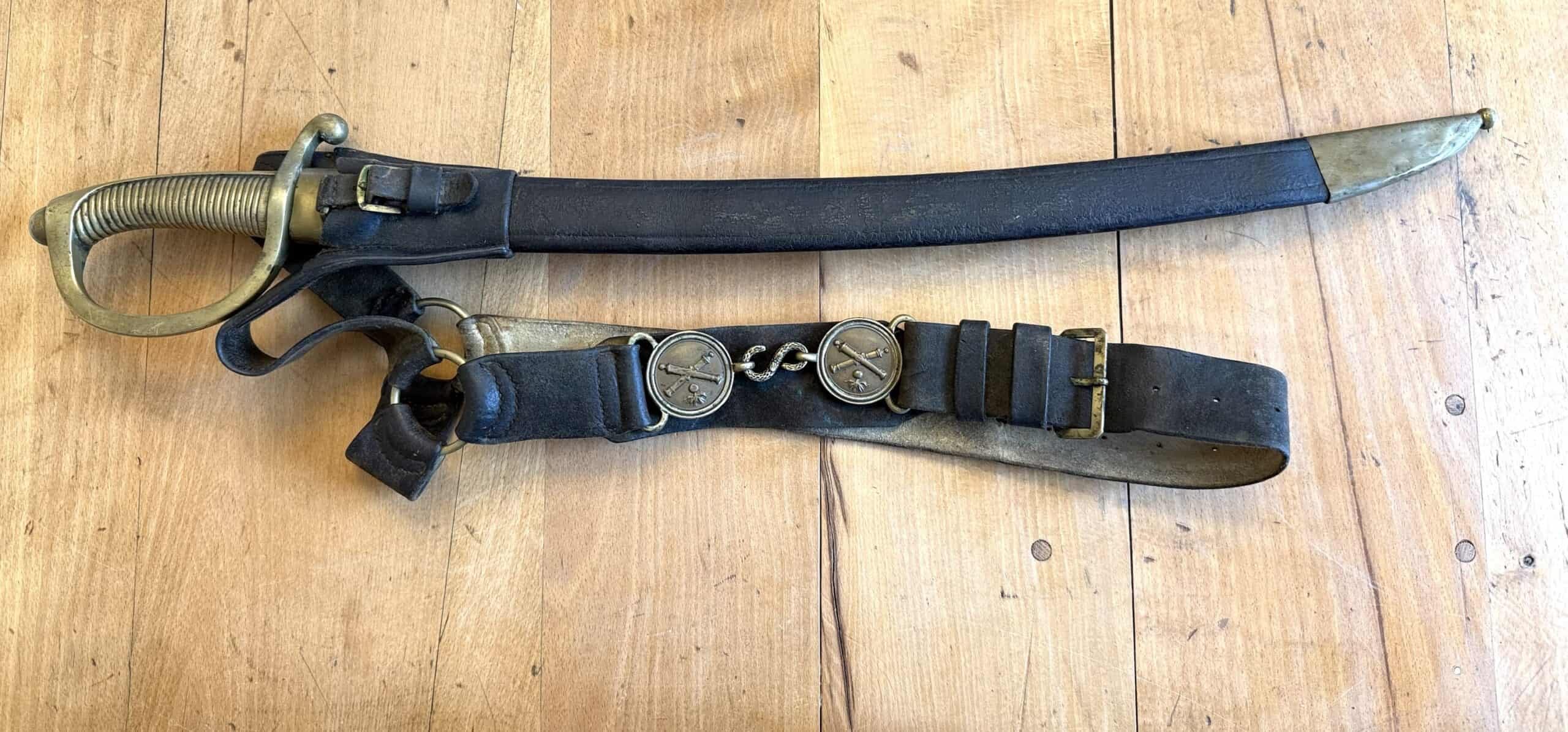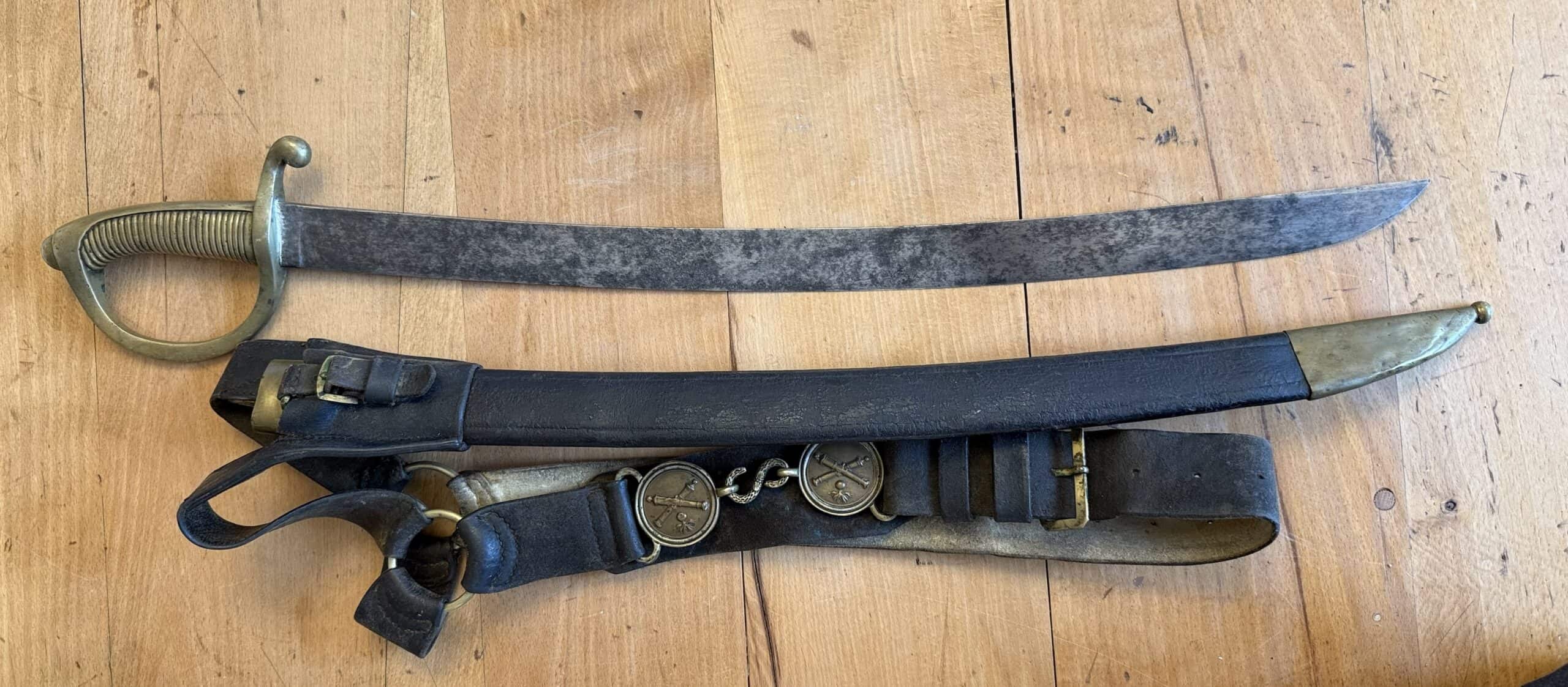 Sehr schöner Säbel, inkl Scheide und originalem Ledergürtel mit Messingabzeichen.
