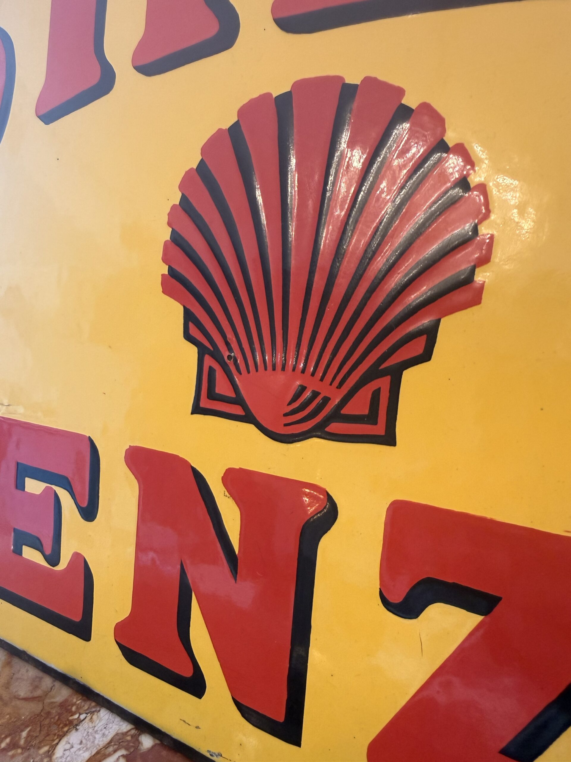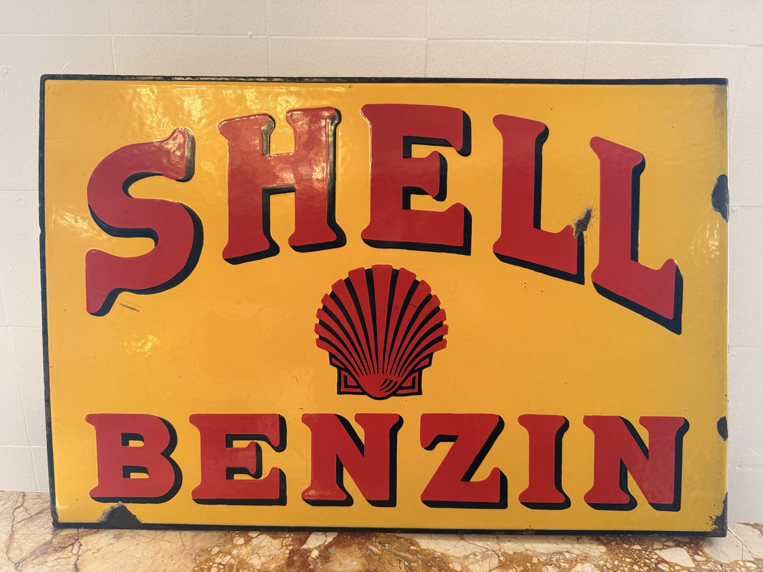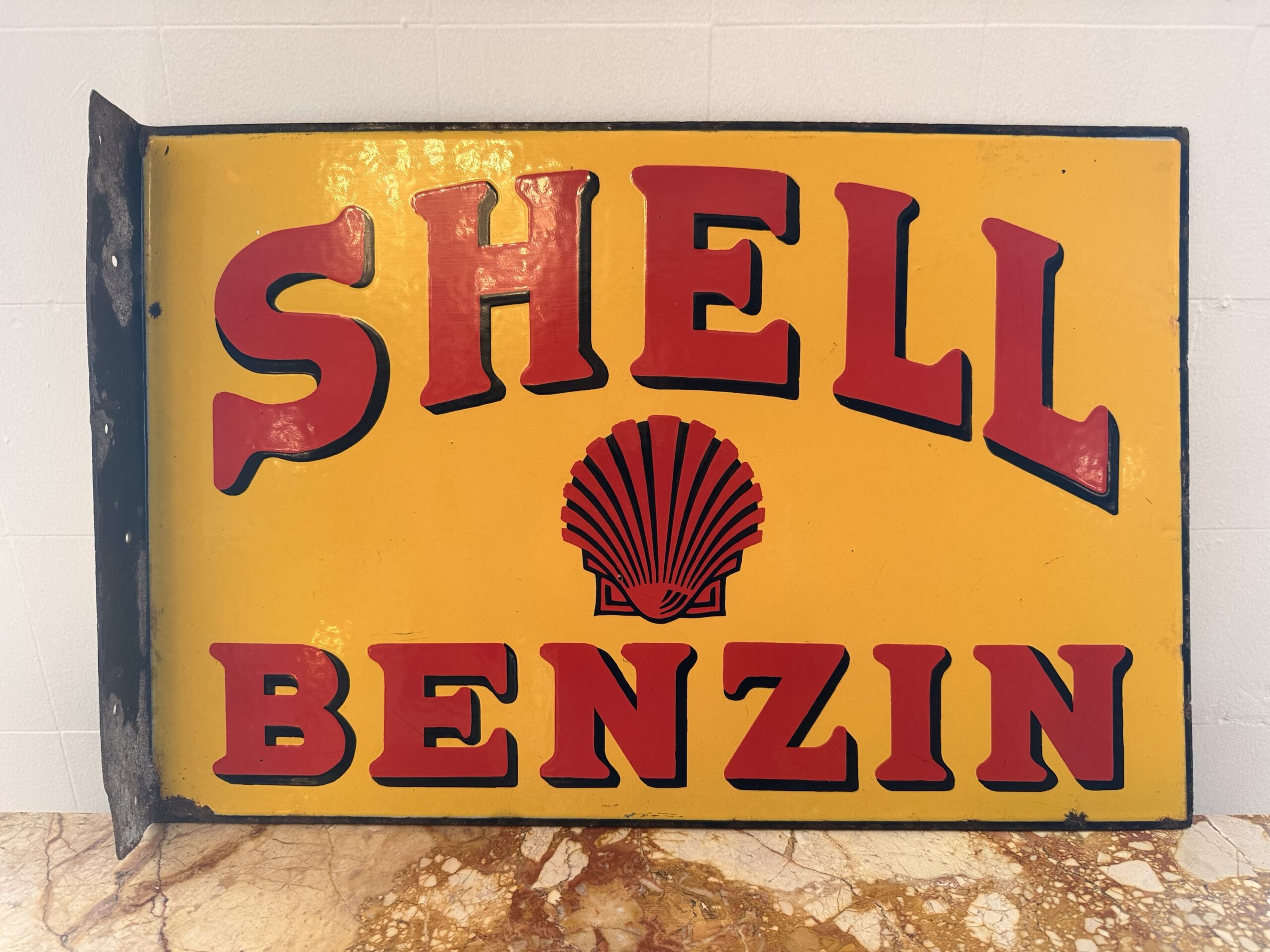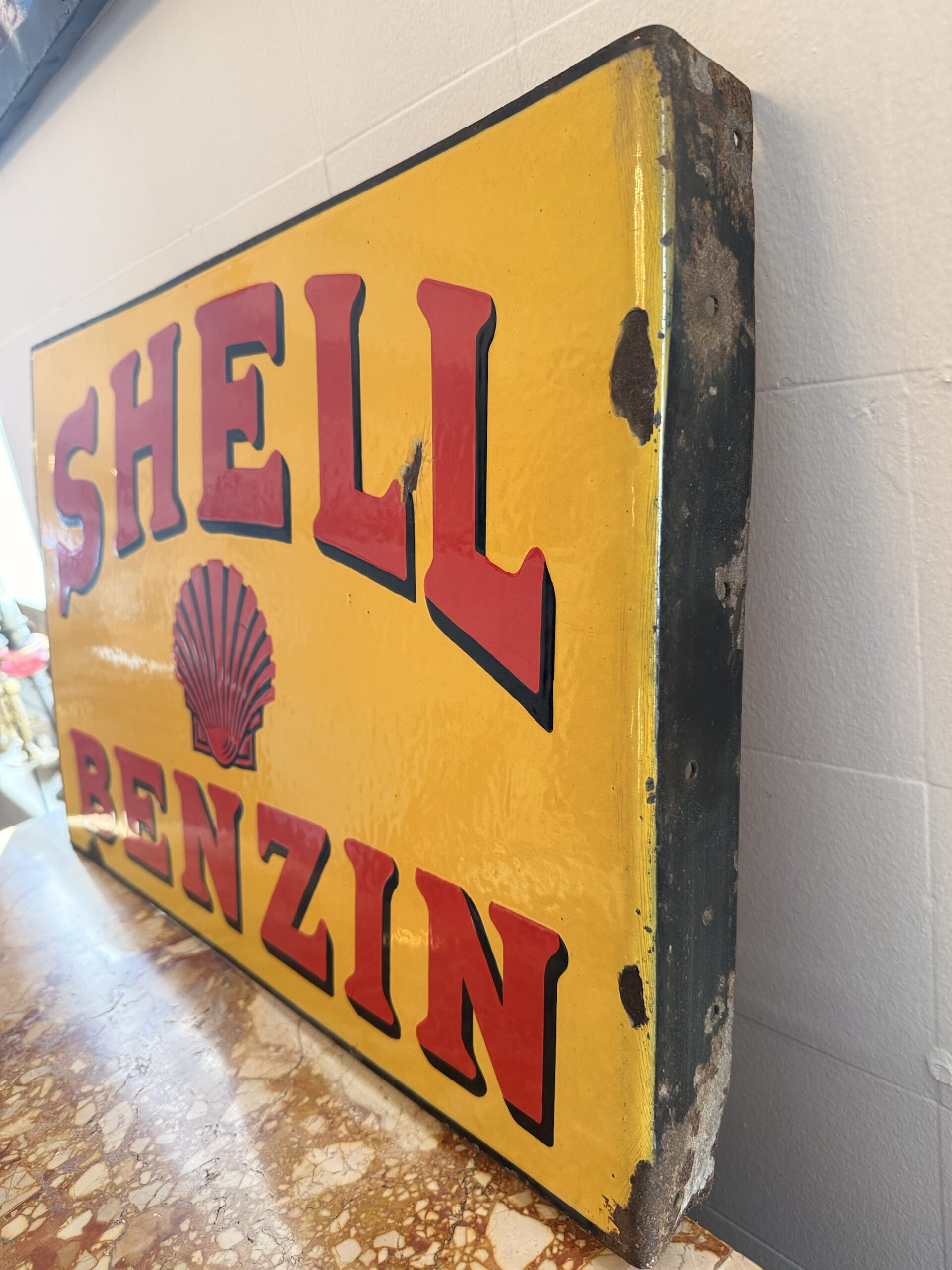 Aussergewöhnliches und sehr frühes Shell Emailschild in sehr schönem Originalzustand, doppelseitig.