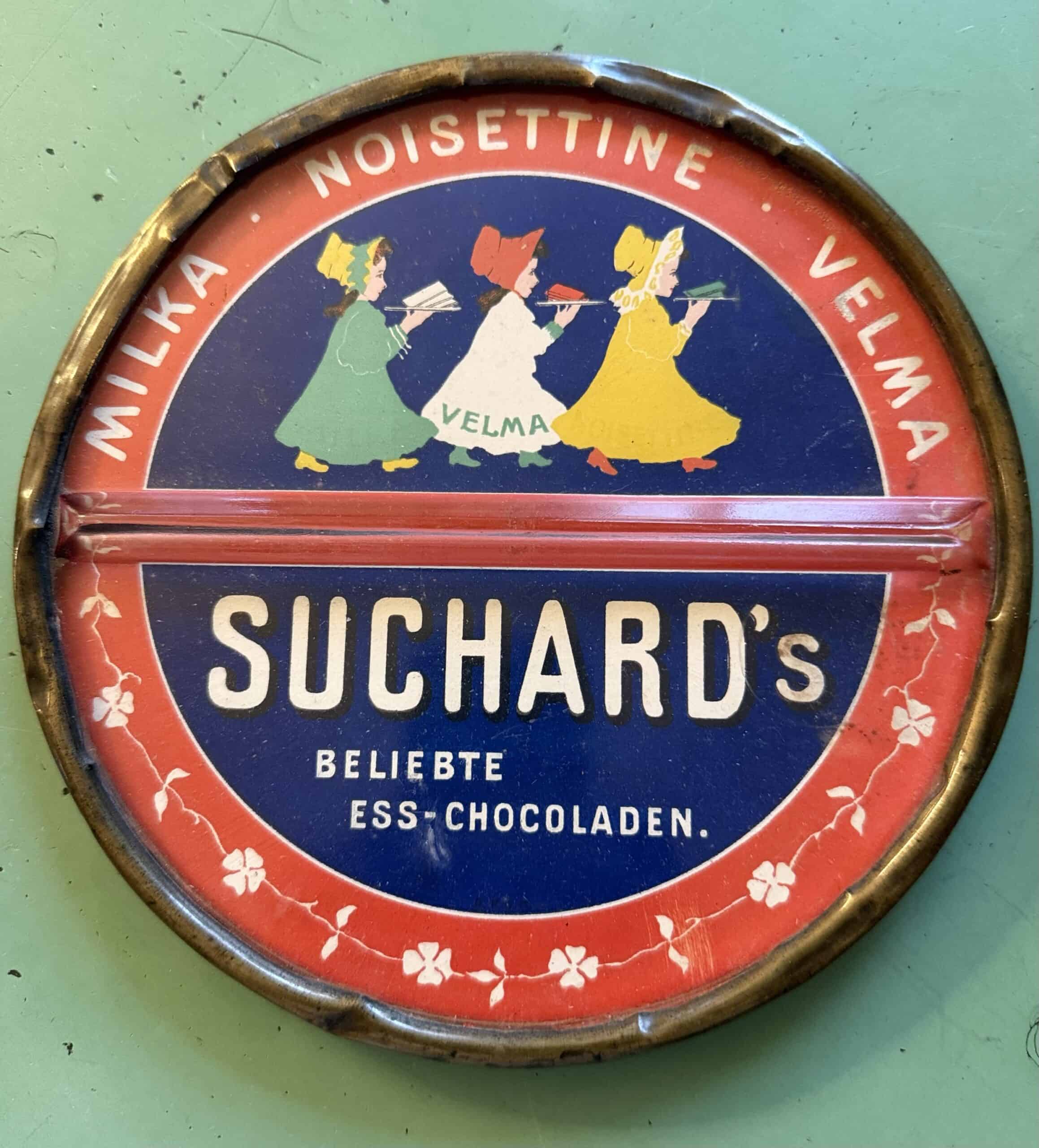Seltener Zahlteller von Suchard aus Glas mit Messingrand, in sehr gutem Zustand.