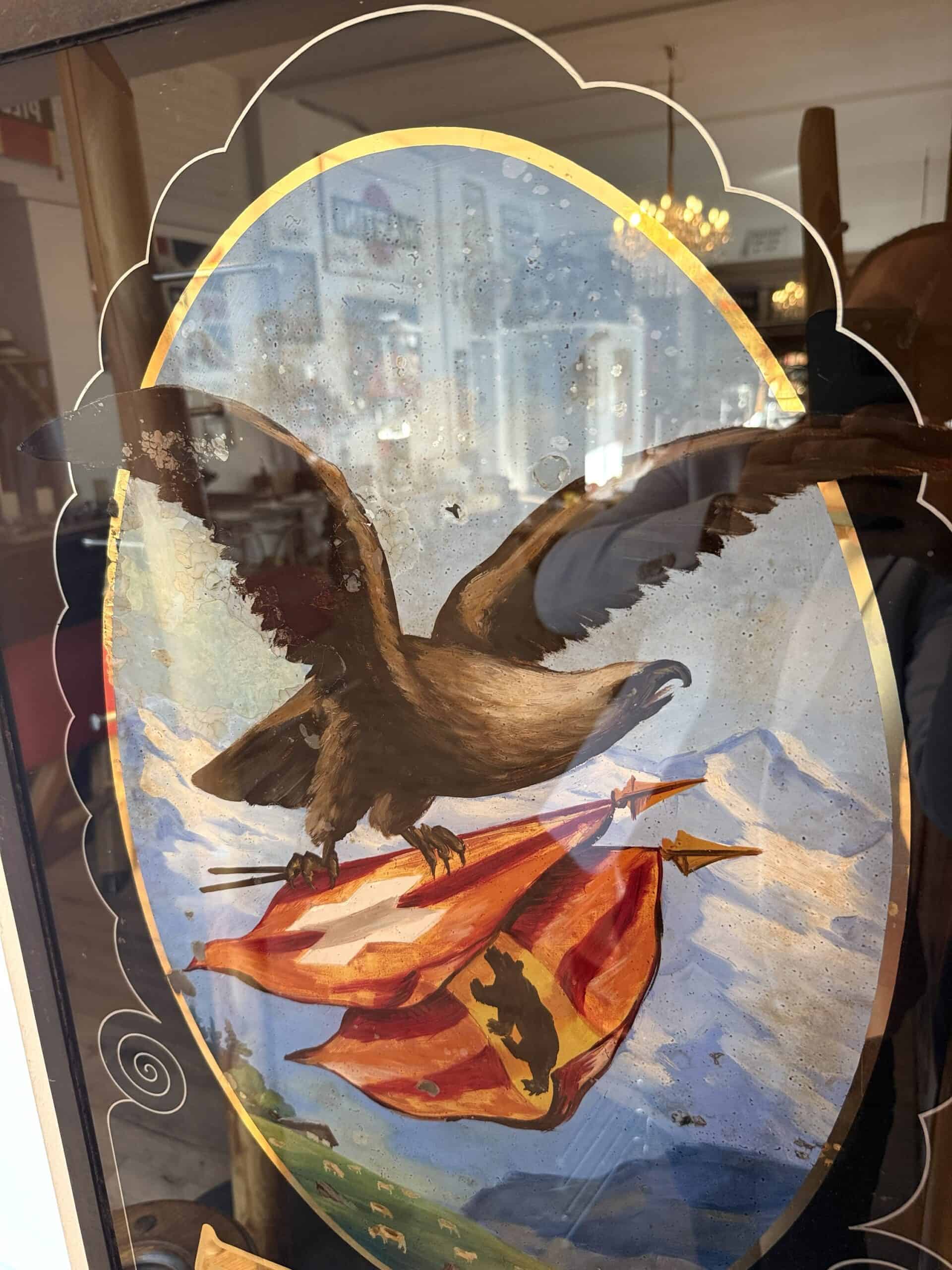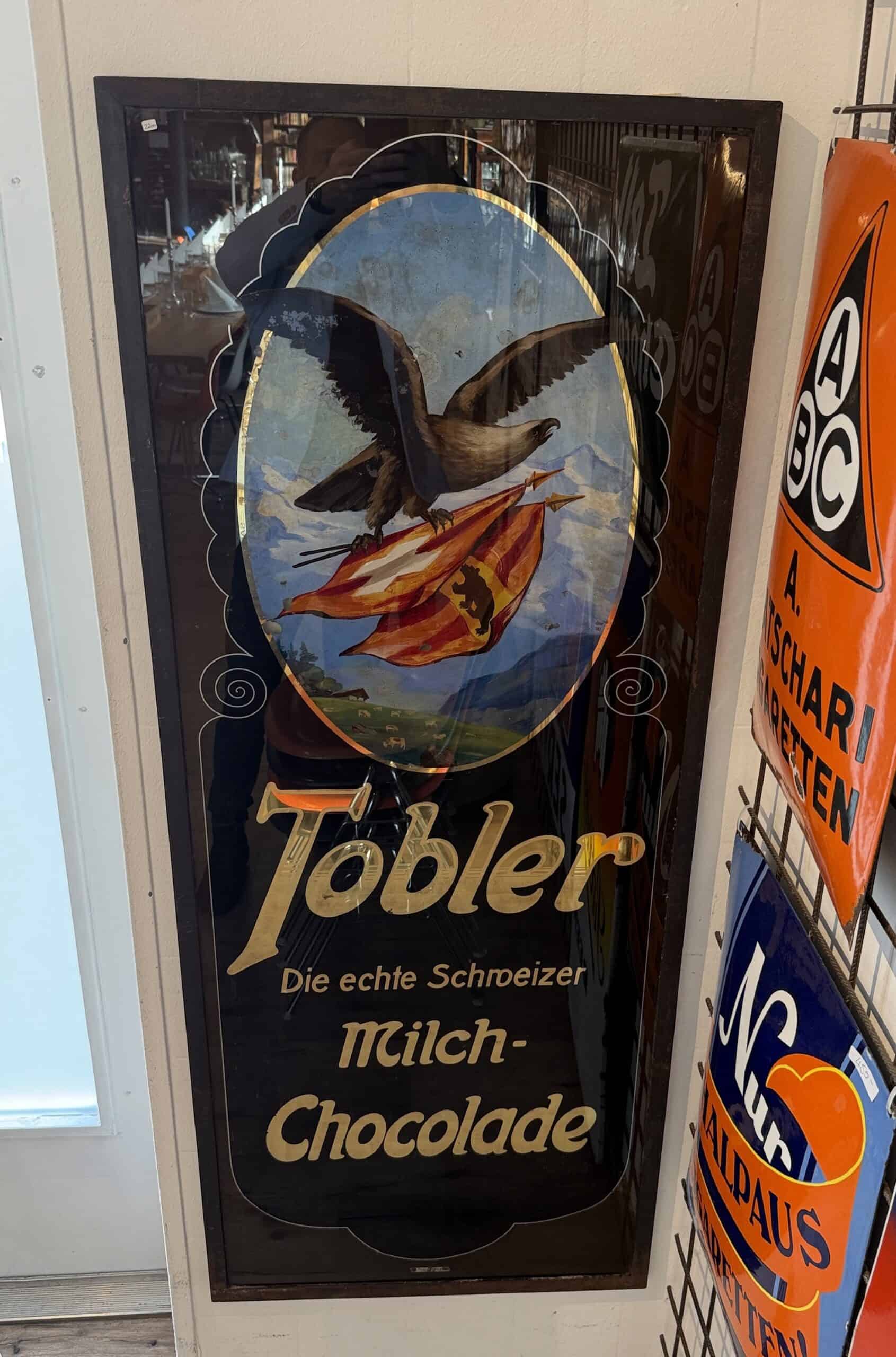 Aussergewöhnliches Hinterglasschild von Tobler Bern, mit dem Adlermotiv, das früher die Bieler Altstadt Schmückte.