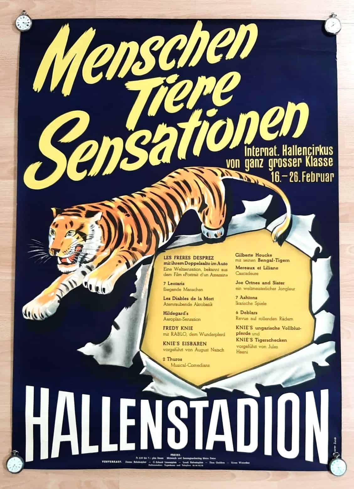 Ein prachtvolles Plakat des Internationalen Hallenzirkus kündigt die Veranstaltung im Hallenstadion an – mit Menschen, Tieren und atemberaubenden Sensationen. Sie werben mit fliegenden Menschen, bengal Tigern und weltmeisterlichen Jongleuren. Ein wunderschön gestaltetes Werk, hergestellt von den Gebrüdern Maurer in Zürich. Das Plakat ist gerollt und hat einige Randschäden und Falten (siehe Fotos).